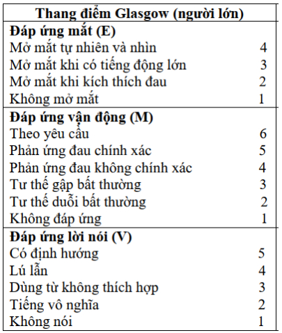 Biện luận: Bình thường: 15; Bất thường ≤ 14; Hôn mê ≤ 8