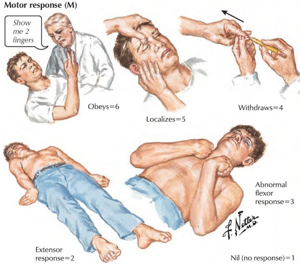 3. Đánh giá M (Motor Response) - 5. Chính xác 4. Ko chính xác 3 gồng 2 duỗi