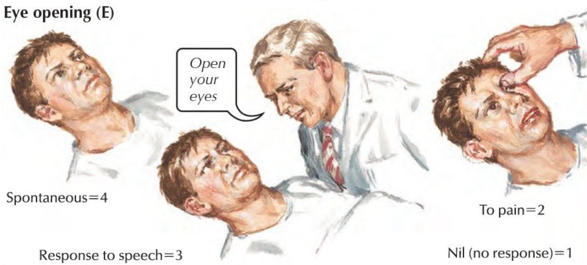 1. Đánh giá E (Eye opening) – 3 kêu 2 đau
