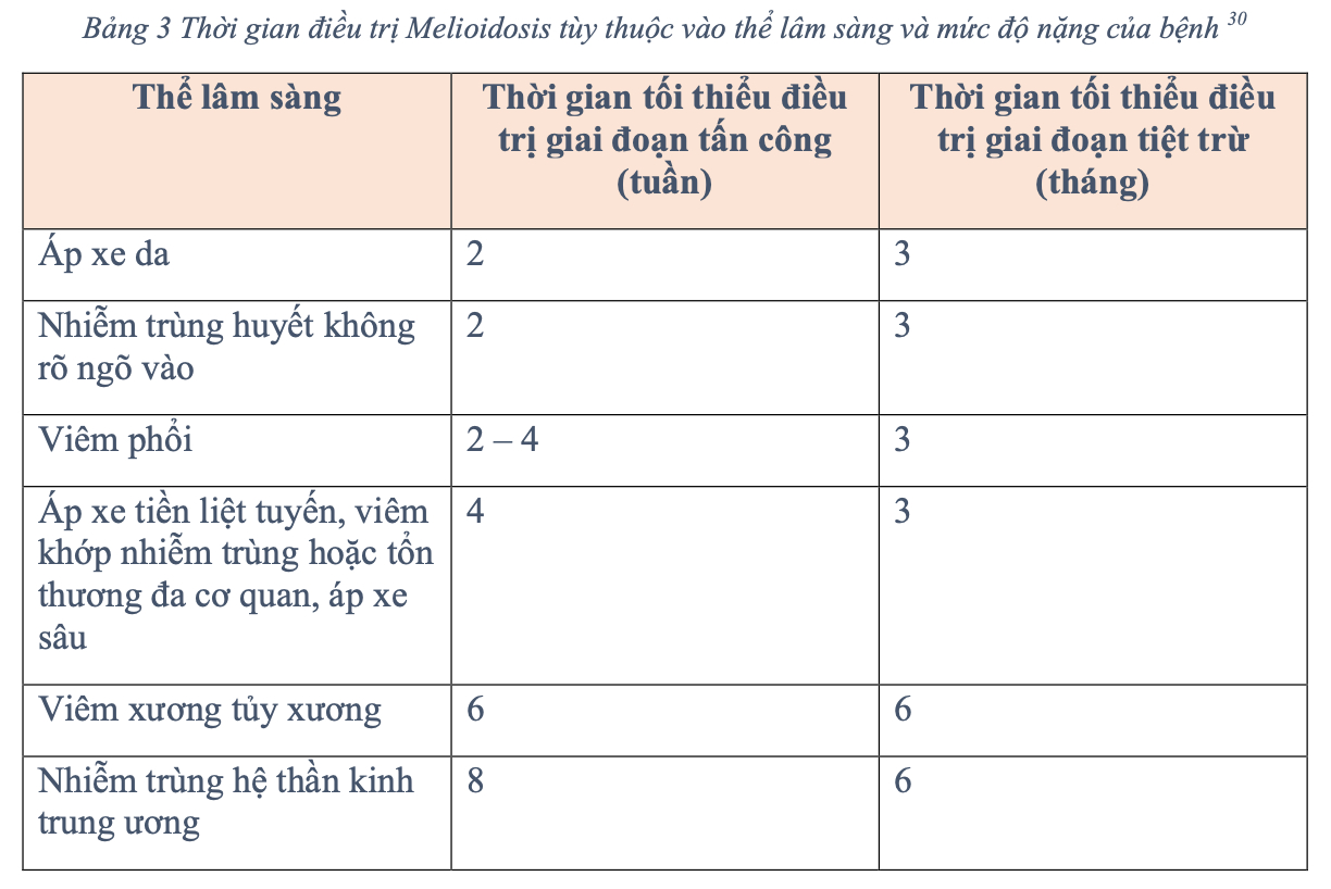 Hiện nay, việc điều trị bệnh melioidosis được đồng thuận bao gồm 2 giai đoạn: giai đoạn cấp tính là điều trị tấn công, mục đích là ngăn bệnh nhân tử vong do nhiễm trùng huyết, giai đoạn thứ hai là giai đoạn duy trì (diệt trừ), mục đích là tiêu diệt hoàn toàn vi khuẩn để giảm thiểu nguy cơ nhiễm trùng tái phát.