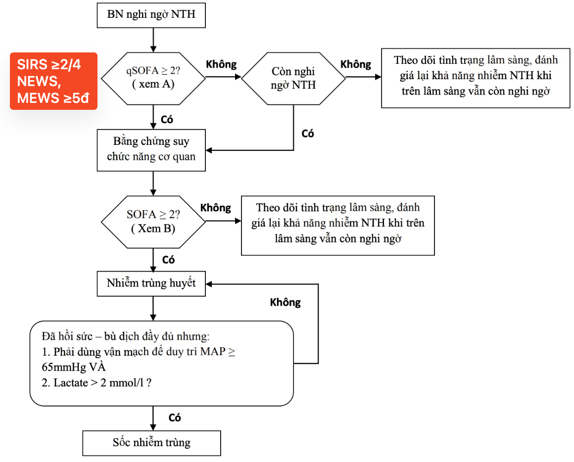 | Sốc nhiễm trùng | Thỏa 4/4 - Nhiễm trùng huyết; VÀ - Cần sử dụng thuốc vận mạch để duy trì huyết áp trung bình (MAP) ≥ 65 mmHg; VÀ - Lactate/máu > 2mmol/L (18 mg/dL); VÀ - Mặc dù đã bù đủ dịch (bù r nhưng ko đáp ứng với bù dịch) |