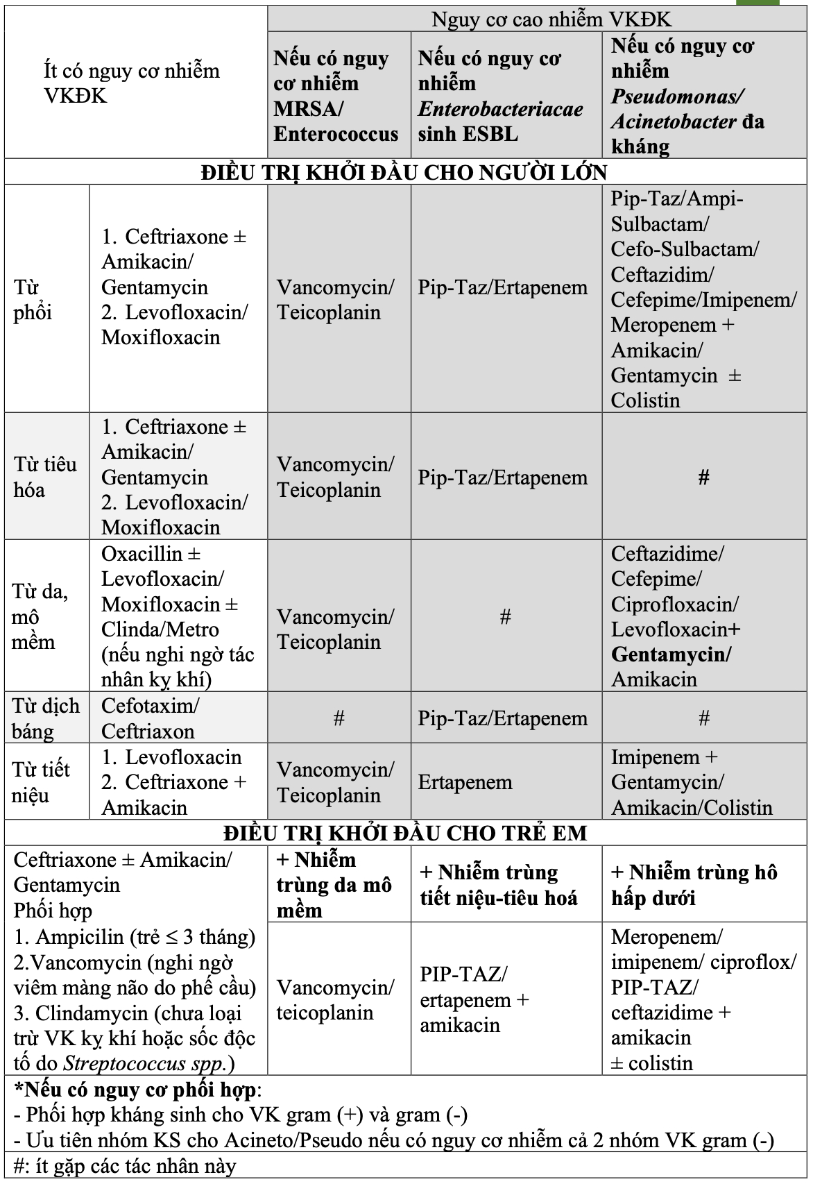 Chọn lựa kháng sinh tuỳ thuộc vào (2): mức độ nguy cơ nhiễm vi khuẩn đa kháng dựa vào mức độ nặng (thang điểm SOFA, pSOFA, và CLIP-SOFA) và yếu tố nguy cơ kháng thuốc