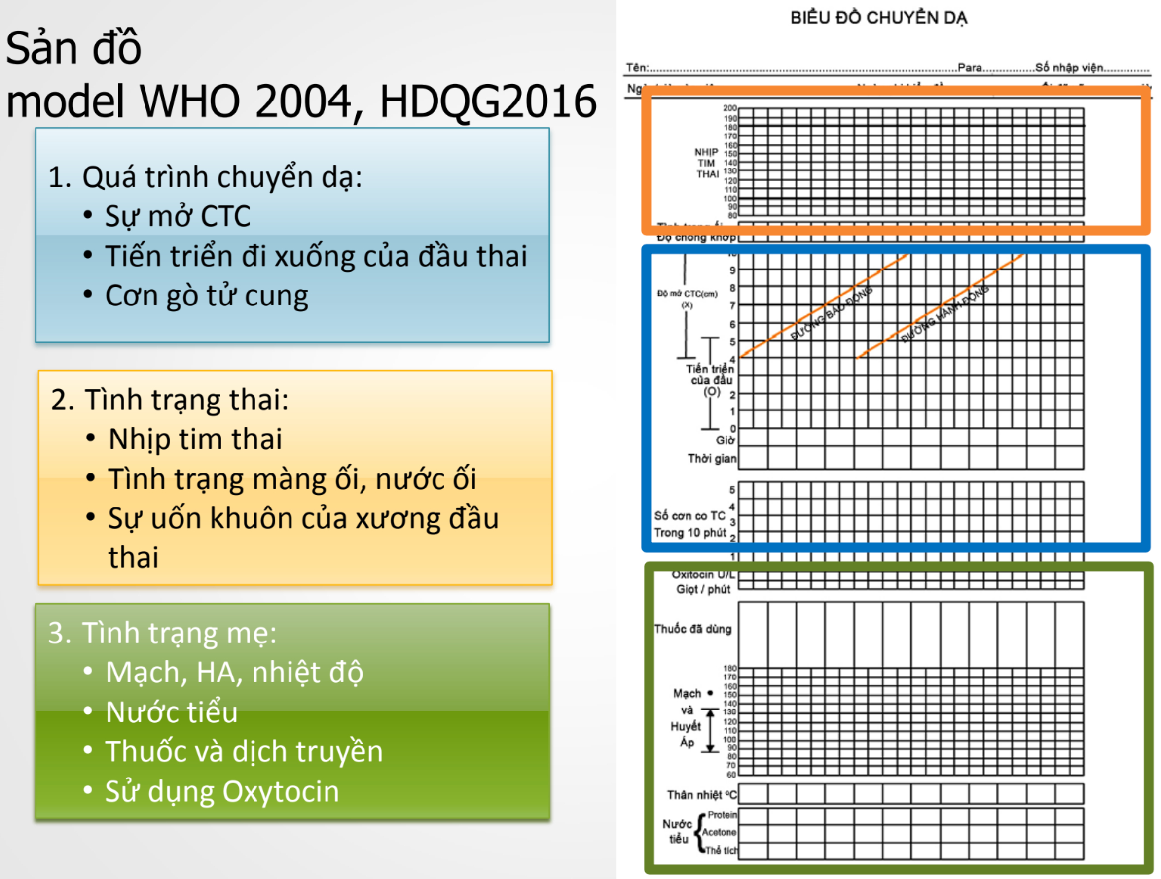 Nội dung của biểu đồ chuyển dạ gồm 3 thành phần chính: tình trạng thai, diễn tiến chuyển dạ và tình trạng mẹ