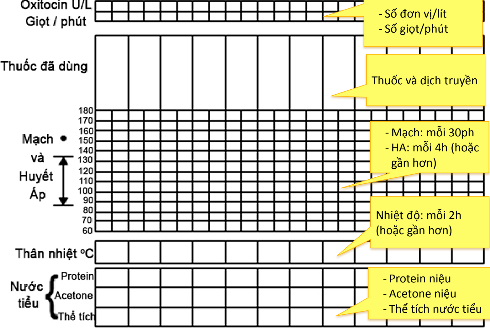 | Sử dụng Oxytocin Thuốc & dịch truyền Mạch, huyết áp, nhiệt độ Nước tiểu - Protein niệu (±) - Acetone niệu (±) - Thể tích nước tiểu: …mL | ![]() |