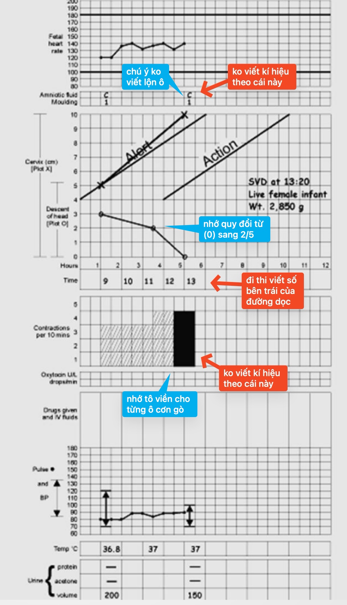 | Cơn gò tử cung | Trục tung: có 5 mốc = 5 cơn gò/ 10p, mỗi 1 ô là 1 cơn gò/ 10p Màu của ô ứng với thời gian của mỗi cơn gò - Trắng (ko tô gì, chỉ tô viền bằng bút): < 20s - Chấm bi: 20-40s - Sọc chéo: > 40s | ![]() |